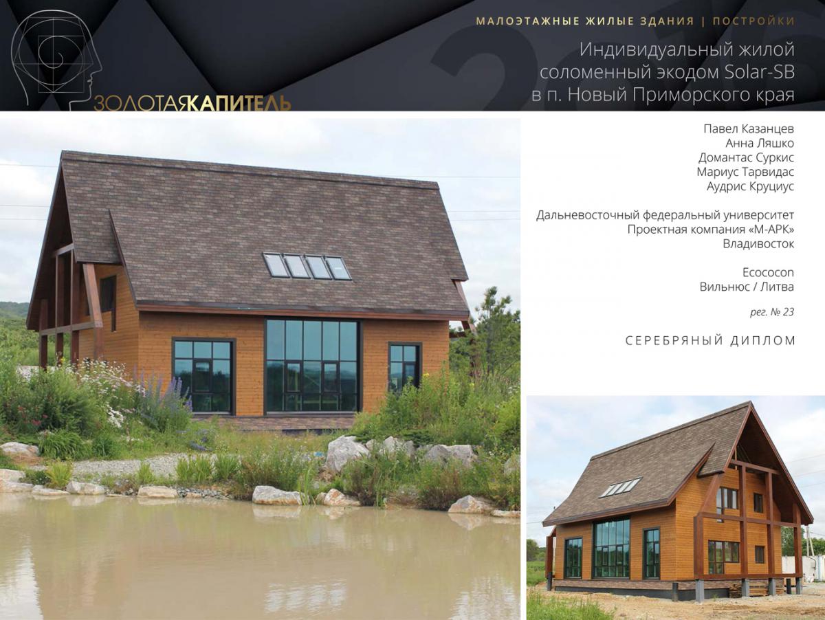 Индивидуальный жилой экодом Solar-Sb награжден дипломом международной экологической премии – Energy Globe National Award 2016. Об этом было объявлено в Вене в прошедший День Земли – 5 июня. В этом году в конкурсе участвовало 1700 проектов из 177 стран мира. В решении жюри отмечено, что сочетание пассивной солнечной архитектуры, активной солнечной системы, устойчивых к влаге и возгаранию конструкций из соломенных панелей, является позитивным примером реализации экологических технологий в малоэтажном домостроении. Особенно это важно для Дальнего Востока России, где подобные экодома единичны, а малоэтажное домостроение на вновь осваиваемых территориях развивается достаточно быстрыми темпами. Над проектом экодома под Владивостоком работал международный коллектив: Владимир Казанцев (инициатор и заказчик проекта); архитекторы Павел Казанцев (ДВФУ), Анна Ляшко (компания М-АРК); разработчики конструкций и технологии соломенных панелей: Domantas Surkys, Audris Krucius, Marius Tarvidas (Экококон, Литва). В 2010 году Energy Globe был присужден другому архитектурному эко-проекту из Владивостока – малоэтажному экодому с пассивным и активным солнечным отоплением Solar-5.....