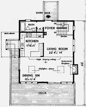 На главном уровне находятся: L-образная общая комната, зонированная на гостиную и столовую; кухня; санузел; прихожая. Из общей комнаты организован выход на большую террасу. Дополнительное освещение общей комнаты устроено через мансардные окна.
