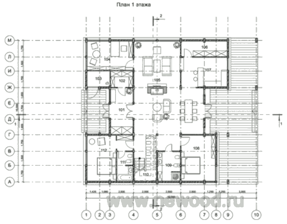 На первом этаже расположены хозяйственные помещения (кухня, кладовая, гардероб, санузлы и котельная), спальни и большая гостиная объединяющая несколько функциональных зон: телевизорная, каминная и столовая.