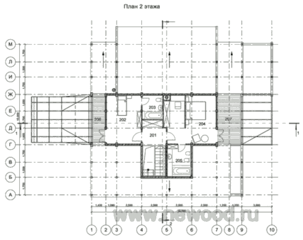 С первого на второй этаж ведет деревянная лестница, поднявшись по которой мы попадаем в приватную зону с детской комнатой и хозяйской спальней (функционально разделенную на гардероб и собственно спальную зону) со своими санузлами. Спальня и детская имеют свои балконы.