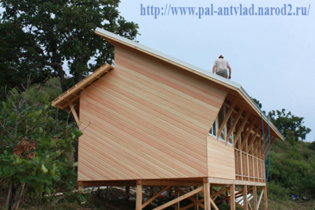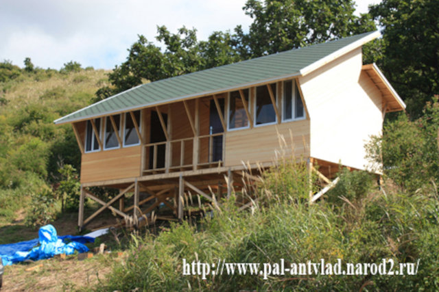 Наружные солнцезащитные жалюзи еще не вывешены, цоколь не оформлен. Южный скат кровли может быть использован под фотопанели - как раз для высокого летнего солнца. Подробно размещено на сайте http://www.pal-antvlad.narod2.ru/