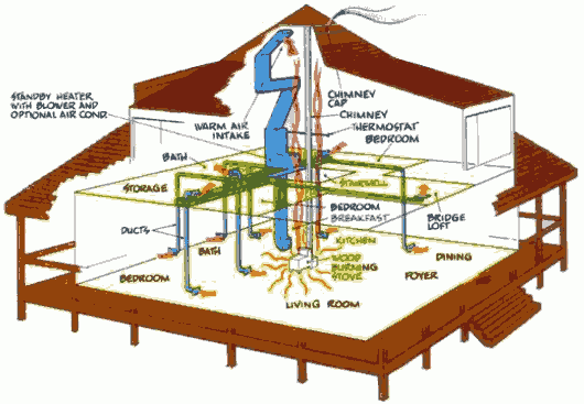 Для повышения эффективности воздушного отопления разработчик расположил небольшую чугунную печь в центре первого этажа, имеющего свободную планировку. Можно сказать, что «дом построен вокруг печки».